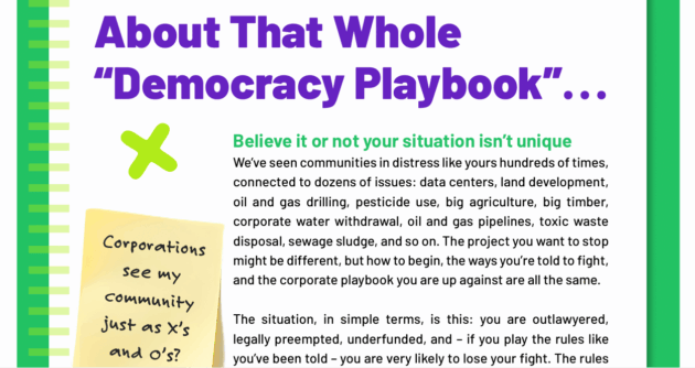 The Primer walks you through the typical scenarios of what you can expect when a corporate project wants to come to town like elected officials saying their hands are tied or that if we just present all the information about how bad this thing is the powers that be will have to stop it.