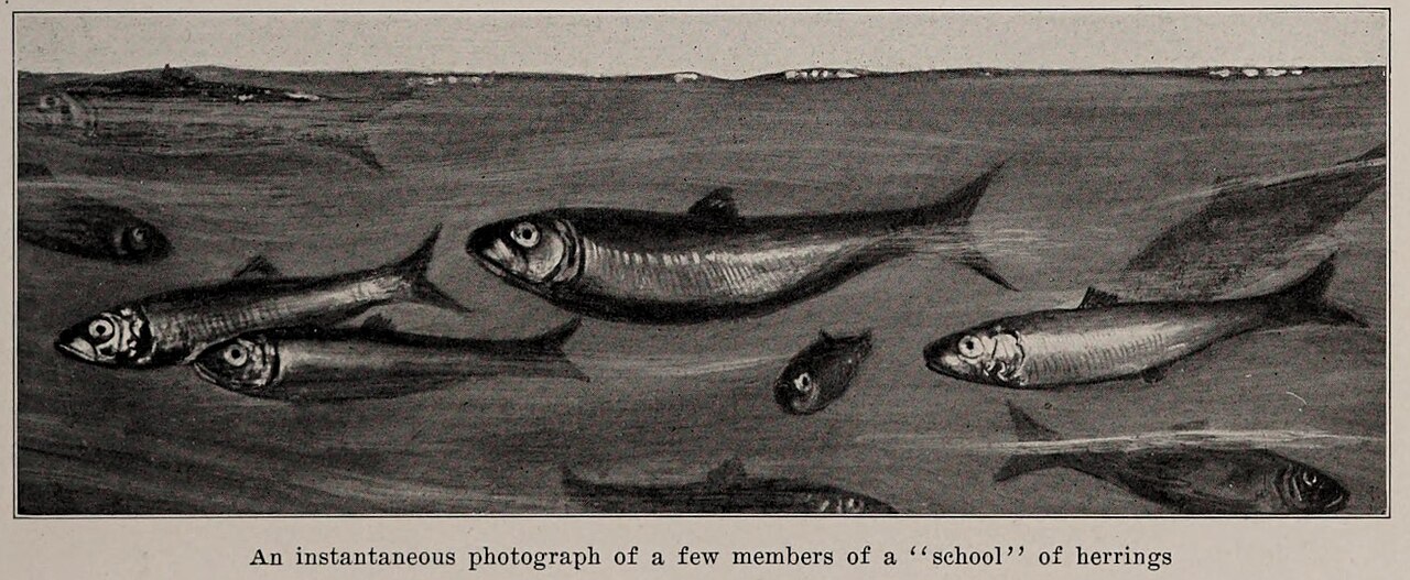 An instantaneous photograph of a few members of a “school” of herring, illustration from The Encyclopedia of Food by Artemas Ward